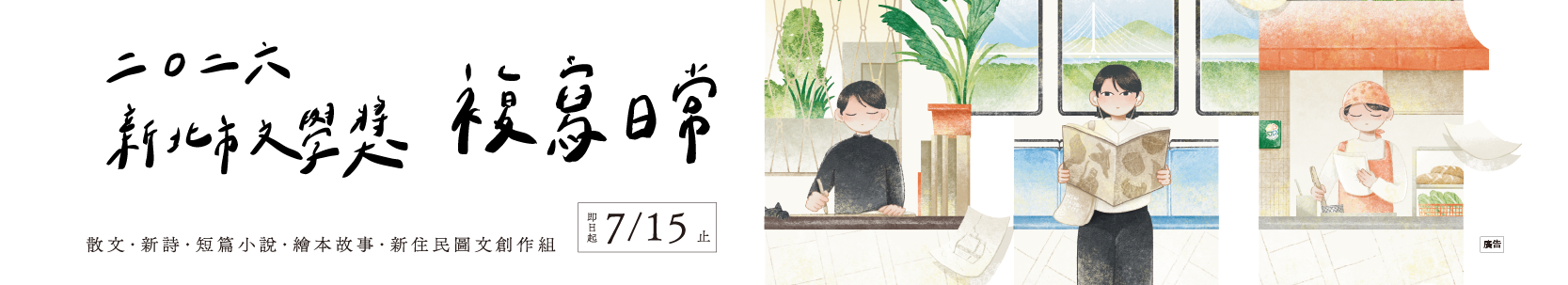 - 「2026年第16屆新北市文學獎」徵件開跑 今年新北市文學獎「複寫日常」徵件開跑,即日起至7月15日止,只要以正體中文書寫創作,不限國籍皆可參賽, 歡迎海內外對文學創作有興趣的朋友踴躍投稿!
